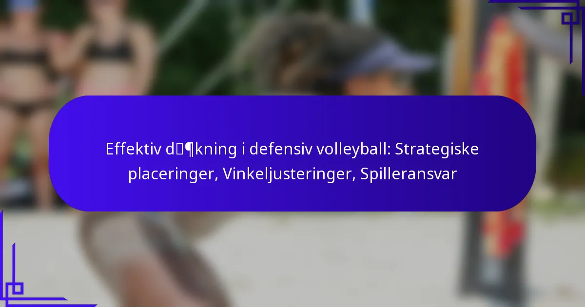 Effektiv dækning i defensiv volleyball er afgørende for at maksimere et holds defensive kapaciteter. Ved at fokusere på strategiske placeringer, vinkeljusteringer og klart definerede spilleransvar kan holdene betydeligt forbedre deres reaktion på modstandernes angreb. At forstå disse elementer giver spillerne mulighed for at forudse bevægelser og optimere deres defensive strategier på banen.