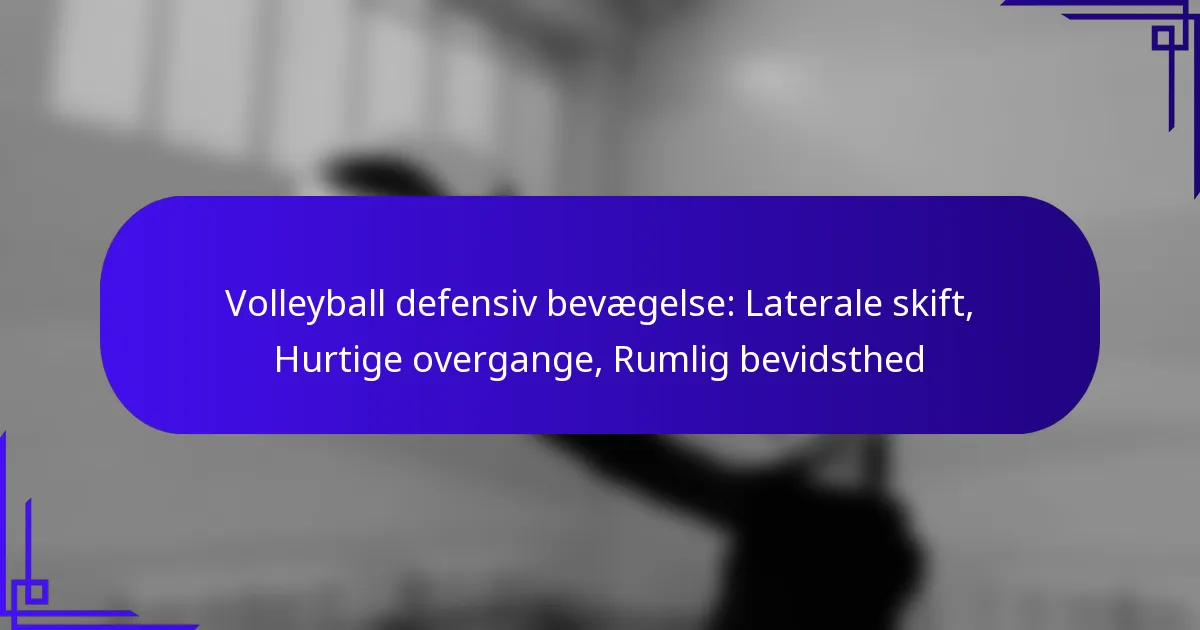 Laterale skift, hurtige overgange og rumlig bevidsthed er essentielle komponenter i effektiv volleyball defensiv. Disse elementer arbejder sammen for at forbedre en spillers evne til at reagere på spillets dynamiske natur, hvilket muliggør optimal positionering og bevægelse under spil.